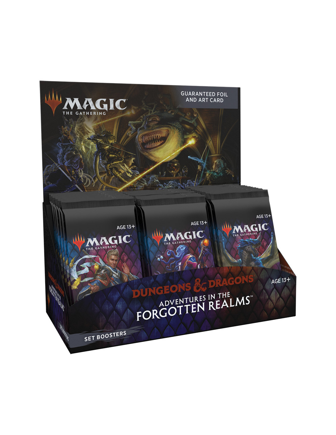 Caja de 30 sobres de Set Boosters de Dungeons & Dragons Adventures in the Forgotten Realms. Cada Set Booster contiene 12 cartas adicionales. Promo Buy a Box: Caja + Carta promo (mientras hay existencias)